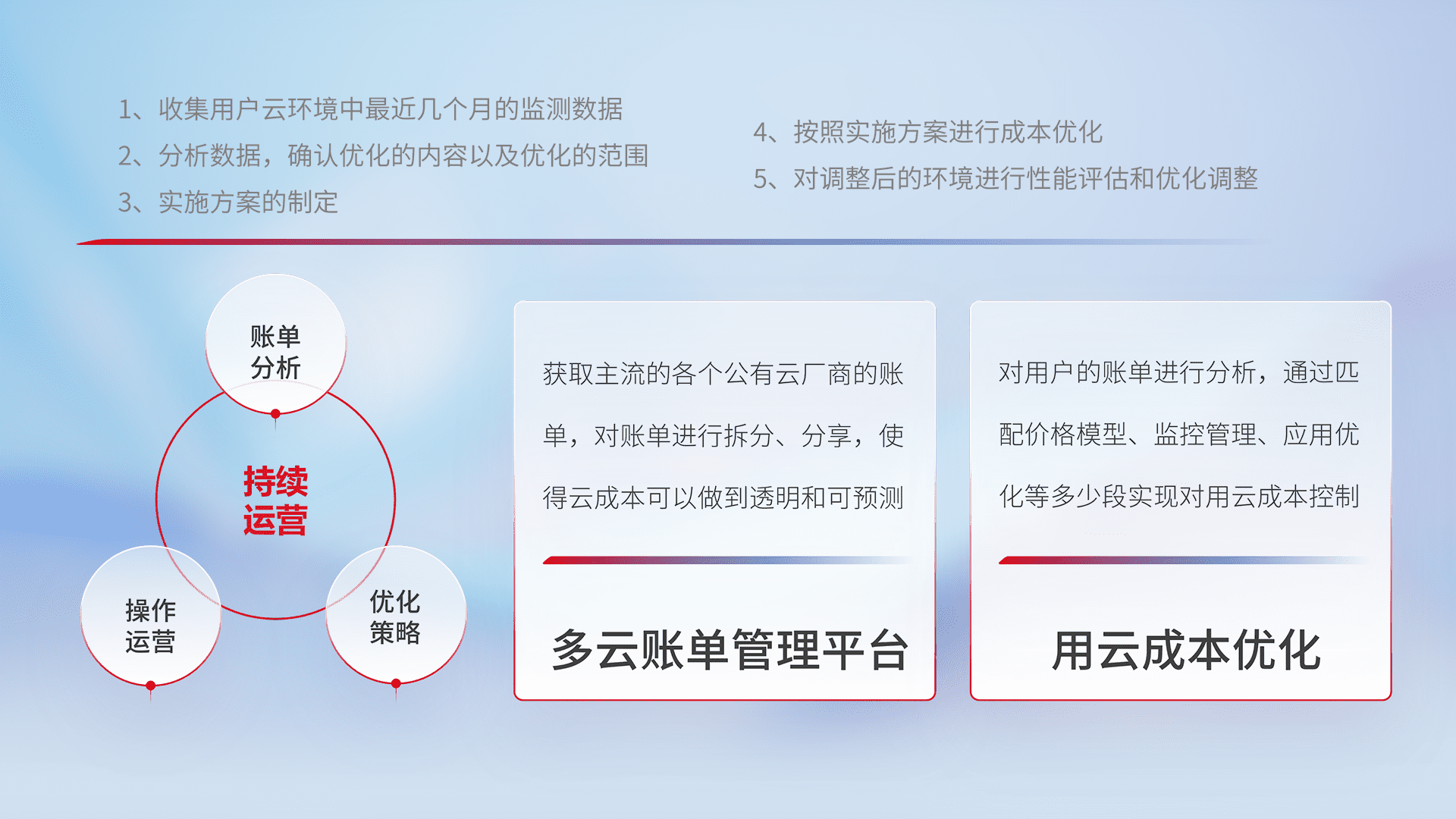 通过多云纳管,,,,以统一的资源数据模型把客户的云资源进行抽象和封装,,,,进而实现对多云资源的统一操作,,保障云资源管理的可靠性、、、、稳定性与可用性。。。量身定制化运维内容,,配置、、、开发运维、、、补丁管理、、、、备份、、、监控、、认证和访问管理、、、审计和日常巡检等,,保障在用云过程中的可靠度,,,,稳定度以及高可用率。。。。